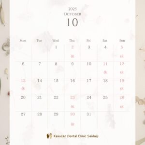 2025.09.30 診療時間について 2025年10月の診療予定 2025年10月診療カレンダーです 10月11日は研修のため休診いたします。 そのため9日(木)は診療です。 13日は祝日のため、16日(木)は診療です お電話でもお待ちしております! 086-201-1898 ご予約はこちらから⇨https://reservation.stransa.co.jp/2a271371d8220c2bf0bf01942009a254 お知らせ一覧へ Before