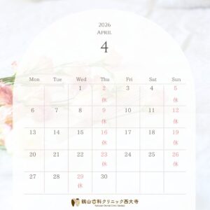 2026.04.01 診療時間について 2026年4月診療予定 4月29日は祝日のため、30日木曜日は診療いたします。 また4月から土曜日は17:30までの診療になります。 ご理解のほどよろしくお願い申し上げます。 お知らせ一覧へ Before